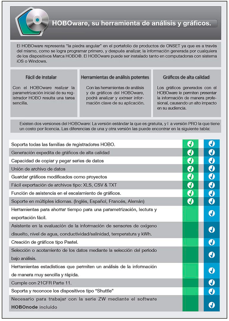 Onset ofrece una gama de poderosas herramientas de análisis mediante las cuales se puede crear diagramas y tablas de la información obtenida de sus registradores. Nuestra herramienta “bandera” es el programa llamado HOBOware Pro, el cual reúne las facilidades antes descritas, el cual puede ser utilizado tanto en computadoras con sistema Windows o Mac. Para aplicaciones que requieren acceso remoto a la información, contamos con el HOBOlink, plataforma basada en WEB la que permite acceso 24/7 a aquella información generada con sistemas de la Serie U30.